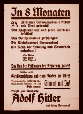 Para llegar hasta allí, Hitler había trabajado sobre varios frentes al mismo tiempo: discurso y propaganda; creación de una fuerza paramilitar conocida como la SA (Sturmabteilung), una retórica fuerte e implacable y alianzas con grupos obreros, burgueses y sindicalistas. Las clases medias urbanas y campesinos estaban empobrecidos y atemorizados con los comunistas, añoraban un "líder fuerte", que diera seguridad. Y Hitler, tal como explica Florencio Jiménez Burillo en
