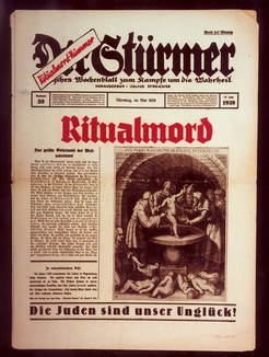 Primera plana del número más popular de la publicación nazi, Der Stürmer, mostrando un supuesto homicidio ritual cometido por judíos.